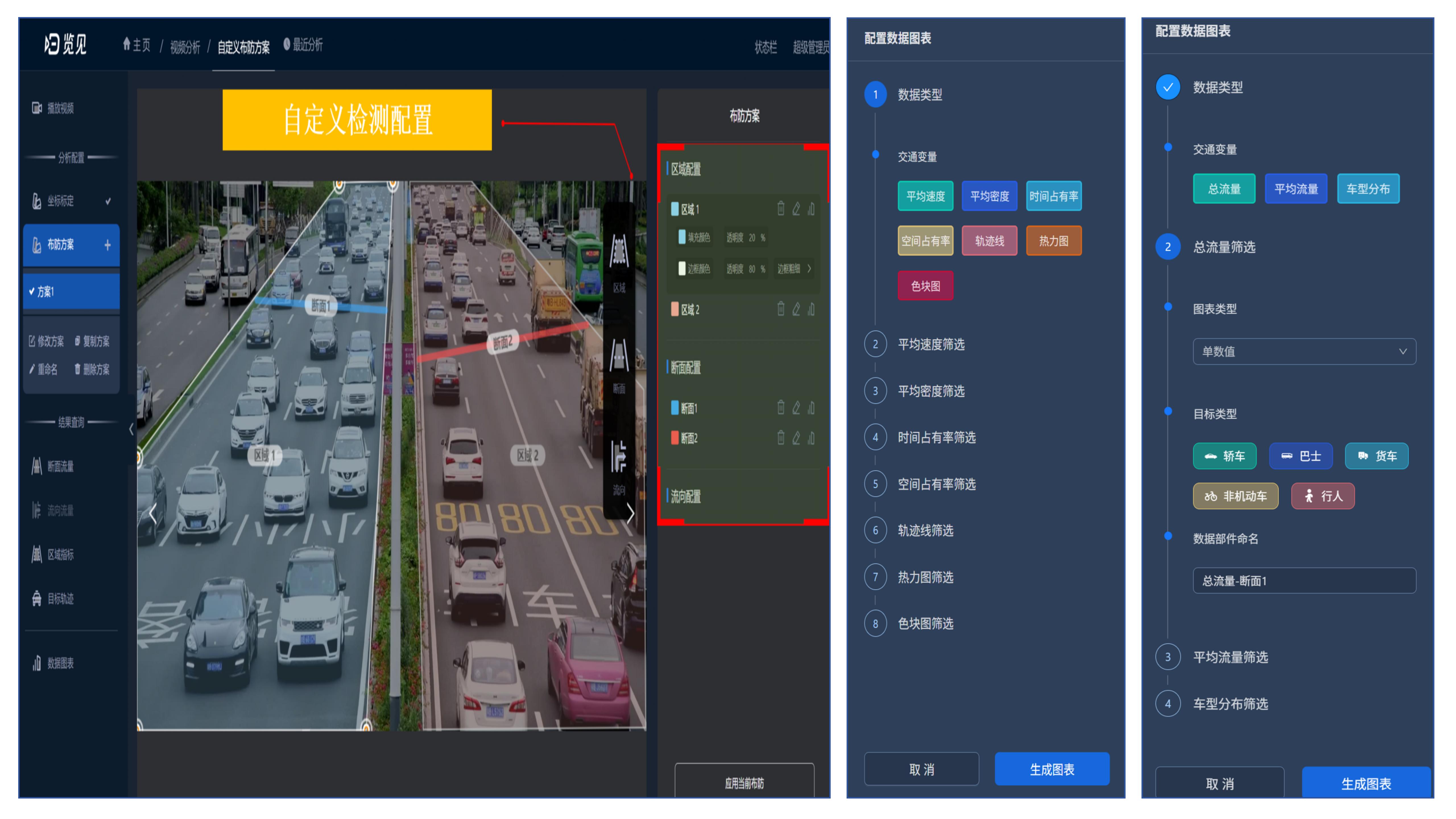 提供自定义检测区域、断面与流向绘制工具,帮助用户快速建立交通检测方案,实现交通要素的精准识别与布防分析。